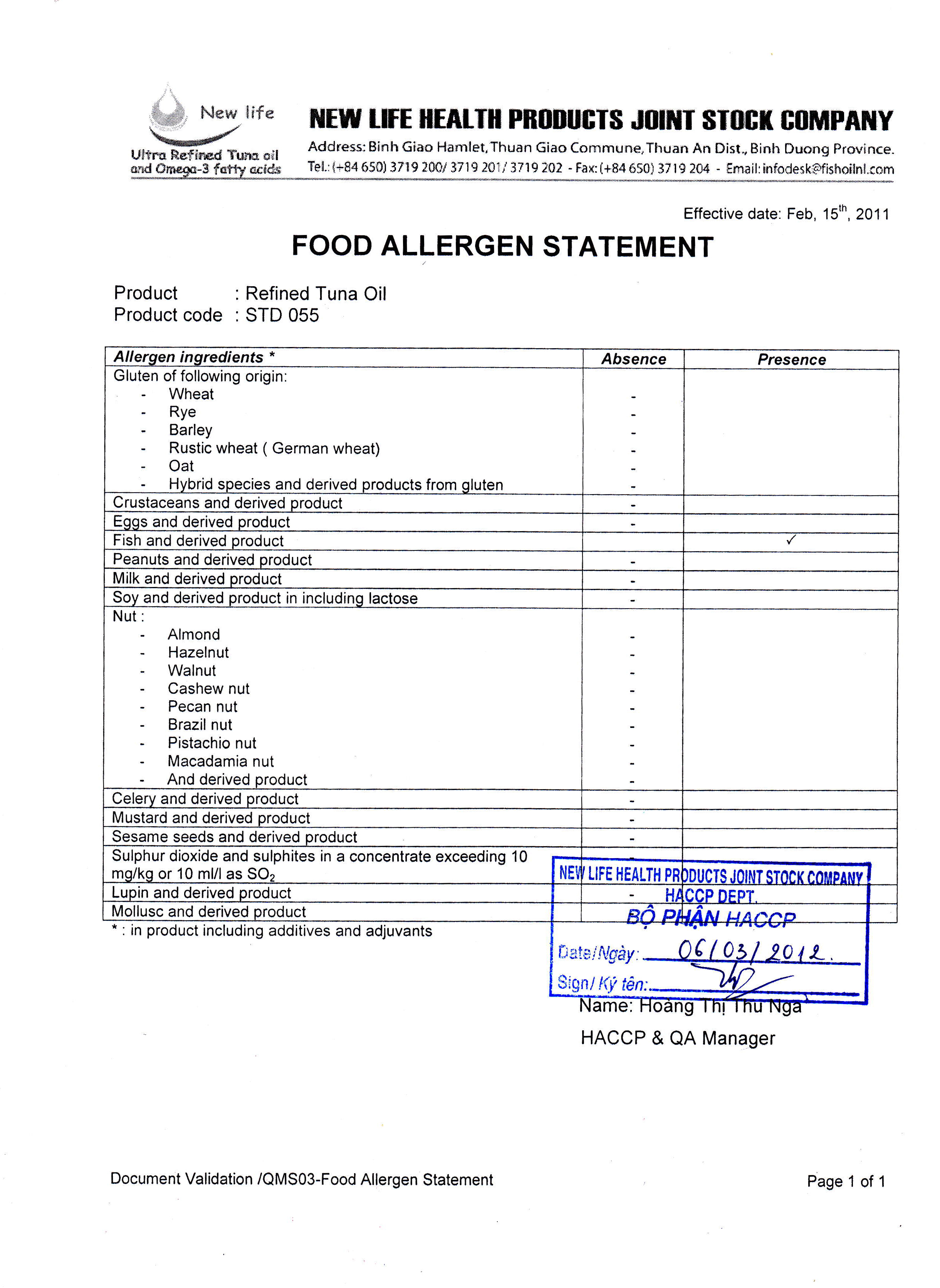 | NM 503 | Hung Thinh Fish Sauce Limited Company (HUNG THINH Co. Ltd.) | Phu Quoc | Kien Giang | PP | 21/02/2011 | |